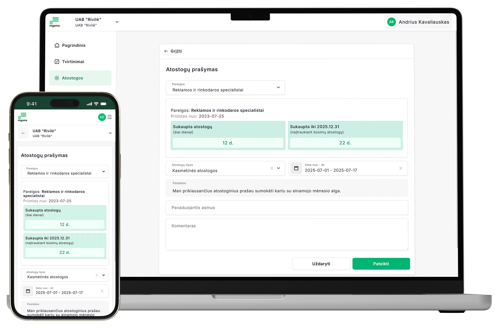 Prašymų teikimas ir tvirtinimas, atostogų likučio ir istorijos rodymas: